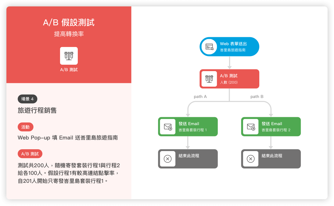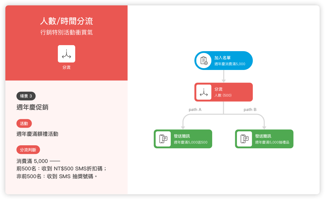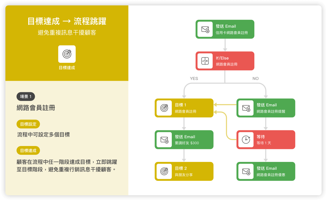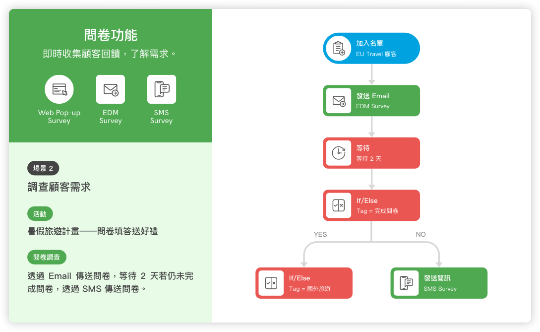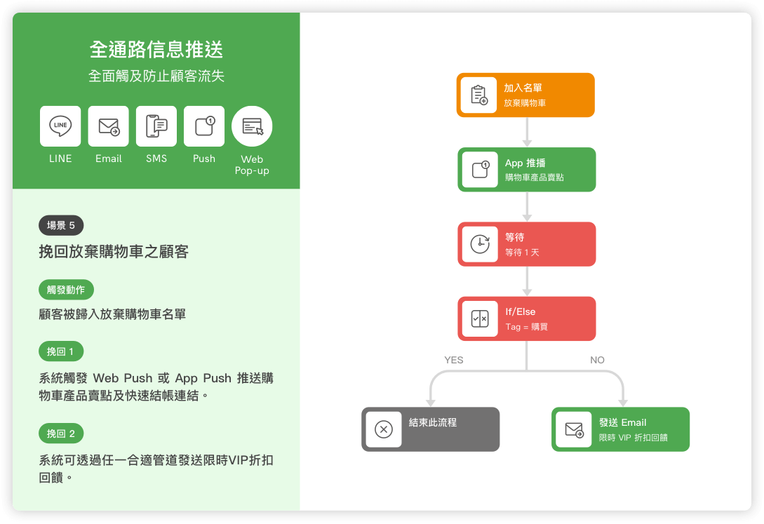 目標達成、問卷功能、行為判斷、時間判斷、全通路訊息推送等各類功能。